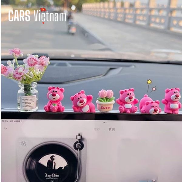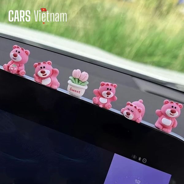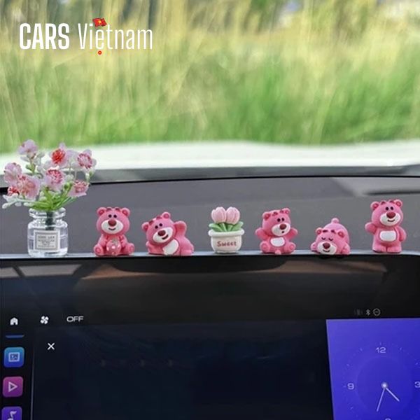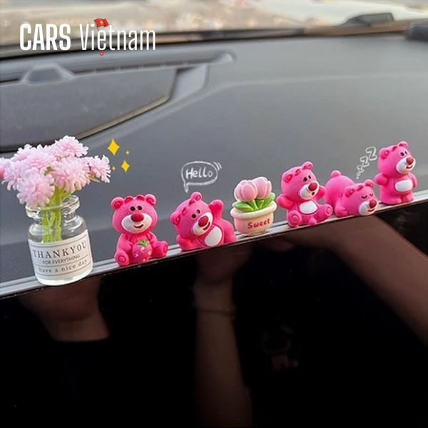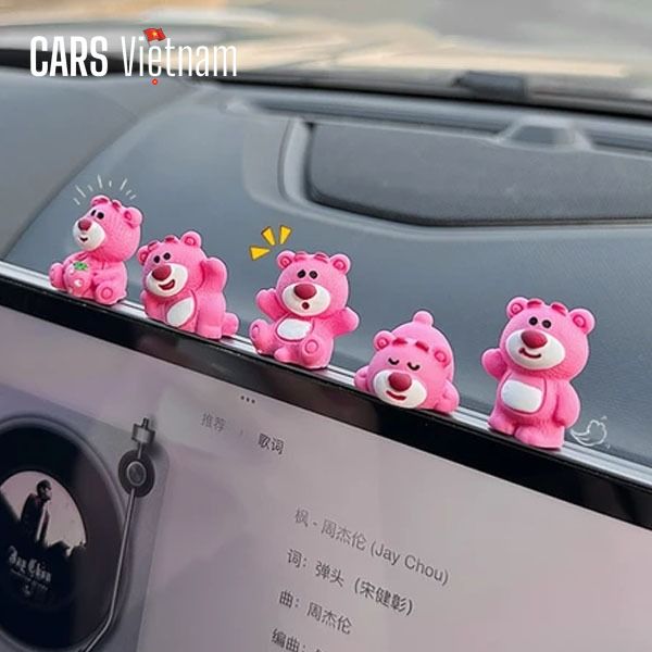 Set gấu Lotso mini trang trí màn hình ô tô bảng điều khiển, mô hình gấu dâu trang trí xe hơi